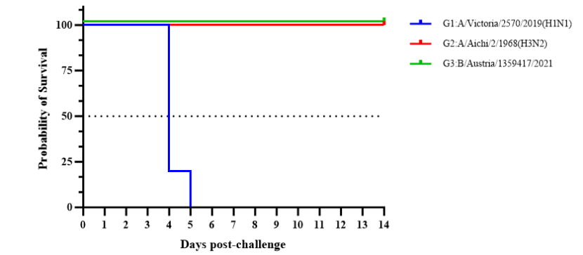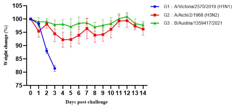 迪福润丝的研发团队在对Balb/c小鼠进行候选疫苗免疫后,对免疫小鼠进行不同流感毒株的攻毒保护实验。实验结果显示经过候选疫苗免疫的小鼠用A型H1N1,H3N2毒株攻毒后,其能有效缓解病毒感染导致的体重下降并促进恢复,小鼠存活率达到100%。候选疫苗展现出显著的保护能力。
